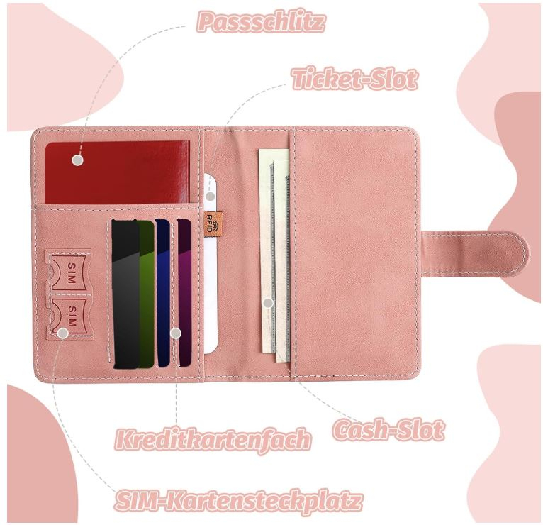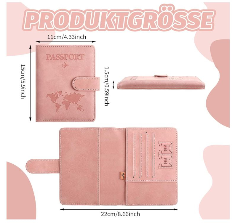 Organizare: suportul pașaportului are mai multe compartimente pentru depozitarea cartelelor SIM, cardurilor de credit, numerarului, biletelor de avion și pașaportului. Suportul pentru pașaport măsoară 15 x 11 x 1,5 cm (22 cm când este deschis), dimensiunea compactă asigură o depozitare curată și ordonată.