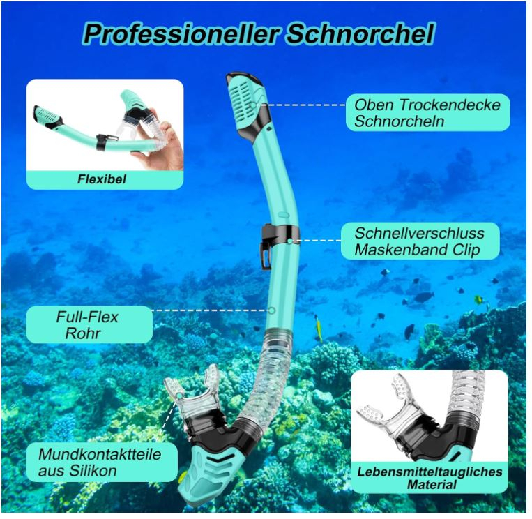 Snorkel cu respirație flexibilă: Cu altă mască completă, este posibil să aveți problema că a rămas puțină apă deasupra supapei după ce a apărut și nu ați putut respira, această problemă cu siguranță nu este aici. Când puțină apă intră în tub, aceasta se adună într-o cameră din partea de jos a tubului și apoi poate scăpa prin supapa inferioară expirând puternic. În plus, tubul este atașat flexibil de ochelari, astfel încât să-l poți regla în înălțime și unghi după dorință.