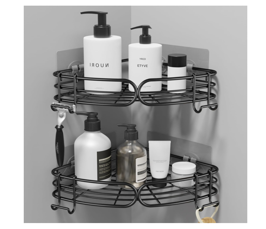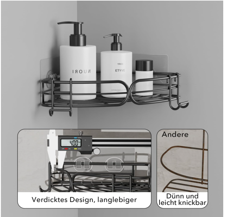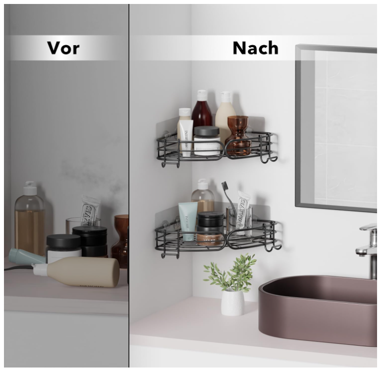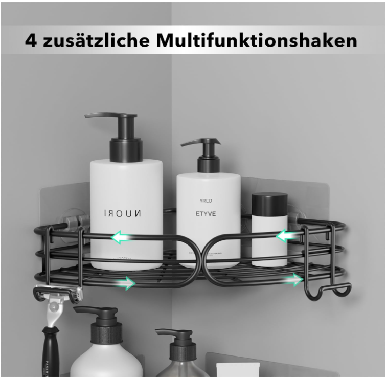 CAPACITATE MARE CU 4 CÂRLIGE - Veți primi 2 rafturi de duș. Raftul de baie este echipat cu 4 carlige mobile suplimentare care pot fi atasate liber in orice loc. Ideal pentru băi precum șampon, demachiant facial, gel de duș, perii etc., burete de baie, aparate de ras sau bile de baie.