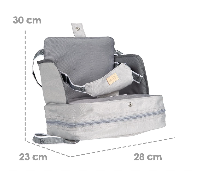 Scaunul de ridicare din panza robusta, hidrofuga, este potrivit pentru copii de la 6-36 luni, poate sustine pana la maxim 15 kg si are dimensiunile 30 x 28 x 23 cm.