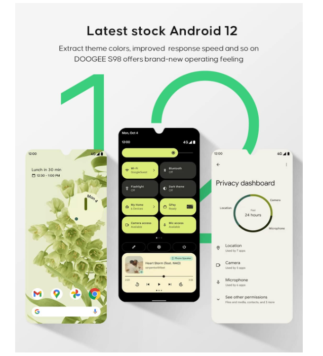 Android 12 și Helio G96: DOOGEE S98 este primul smartphone Android 12 pentru exterior fără contract. Optimizarea performanței cipului octa-core MediaTek G96 aduce o experiență mai rapidă și un consum mai mic de energie, acceptă o rată de reîmprospătare de până la 120 Hz. Android 12 completează upgrade-ul a până la 20 de funcții, iar interfața de utilizator oferă o experiență vizuală excepțională, îmbunătățind în același timp protecția datelor.
