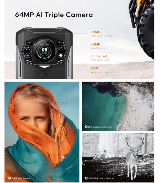 Camere triple de 64 MP și cameră frontală de 16 MP: echipat cu camere triple (camera principală de 64 MP, cameră cu vedere nocturnă de 20 MP și cameră cu unghi larg de 8 MP), telefonul mobil pentru exterior DOOGEE S98 poate surprinde momente de neuitat în detalii clare fără contract . În același timp, camera frontală acceptă înregistrarea video 2k, făcându-vă călătoria captivantă și fără griji.