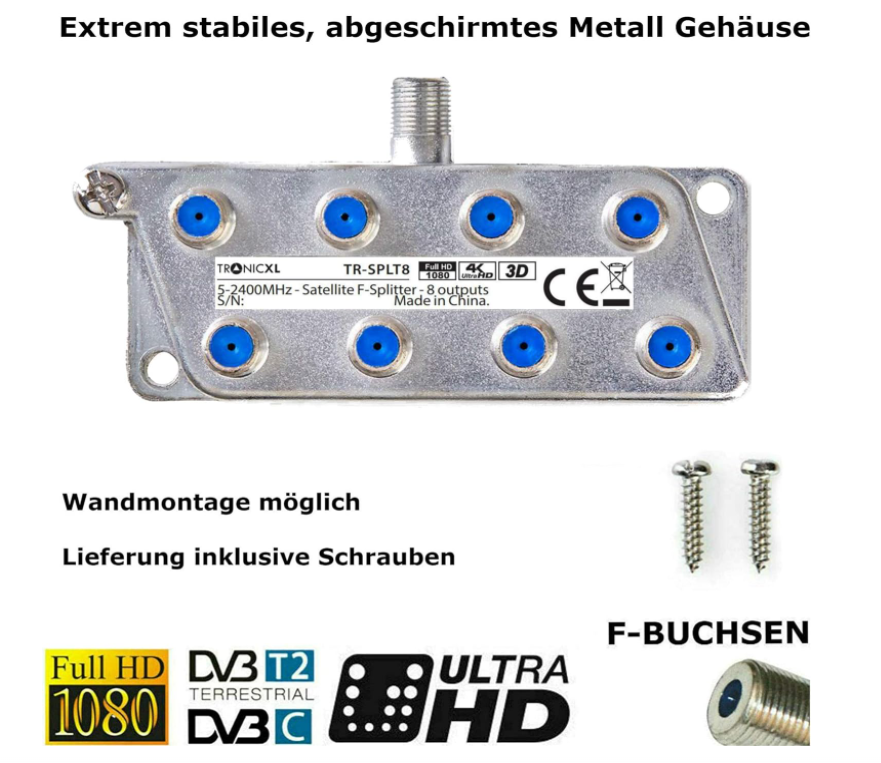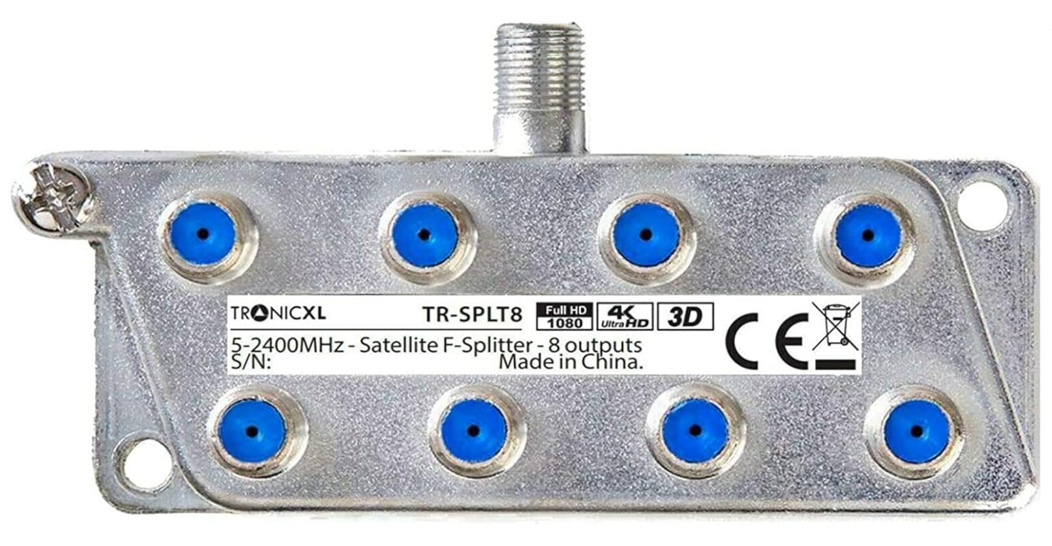 Distribuitor de antenă cu 8 căi: Splitter cu priză F cu 8 căi – pentru distribuirea unui semnal TV către 8 cabluri (participanți).