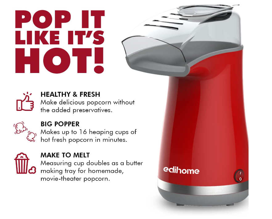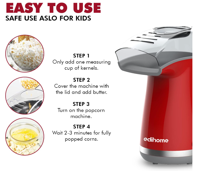 Datorită popcorn-ului edihome, puteți aduce aroma floricelelor în casă ca și cum ați fi la cinema, vă puteți bucura cu familia și prietenii și puteți mânca floricele de porumb de înaltă calitate.