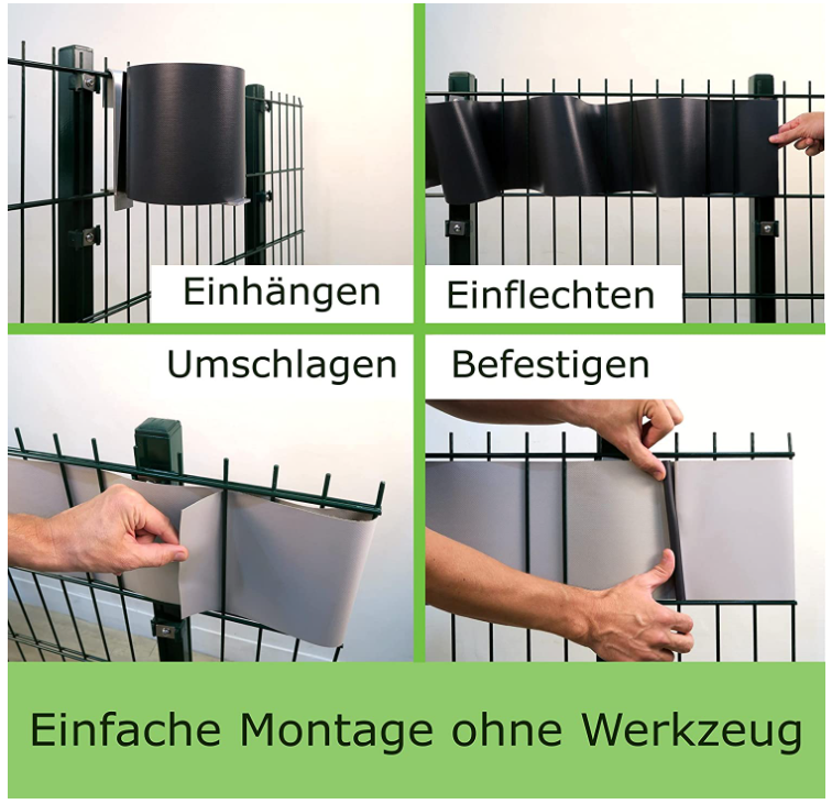 Pentru a atașa benzile de protecție de confidențialitate la gardul de covoraș cu tijă dublă, aveți nevoie doar de o pereche de foarfece pentru a tăia benzile de ecran de confidențialitate a gardului în funcție de lungimea gardului. Folia de confidențialitate este atașată la început și la sfârșit cu cele 26 de benzi de prindere de aceeași culoare furnizate.