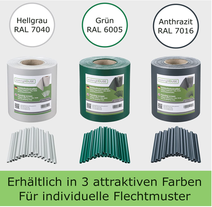 Benzile de confidențialitate Workinghouse din PVC (plastic) sunt rezistente la intemperii, la rupere, nu necesită întreținere și ușor de atașat. Dacă este necesar, gardul de grădină poate fi curățat cu un furtun. Notă: benzile de confidențialitate din PVC au o latură mată și o latură strălucitoare!