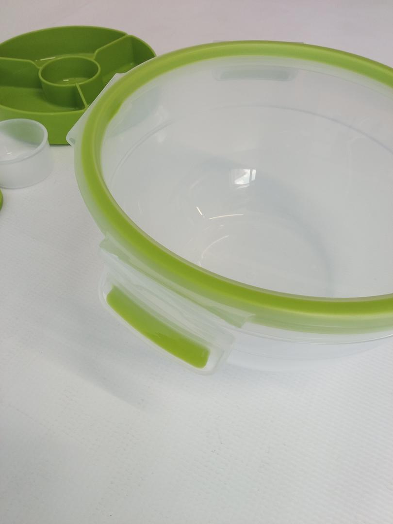 Caserola de salata cu doua compartimente, unul cu capac, pentru a izola sosul si garniturile (rosii cherry, bilute mozzarella).