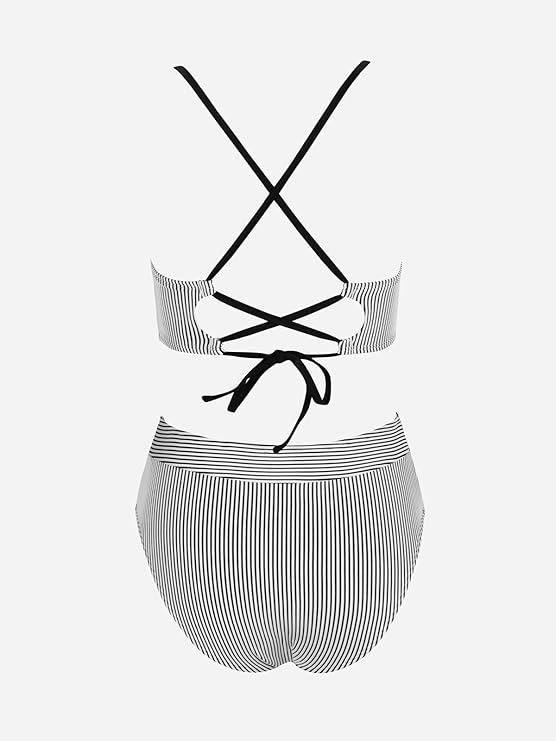 Per total: bikini din două piese cu decolteu în V, bretele încrucișate și legate în spate, model cu dungi, slip de bikini cu talie înaltă