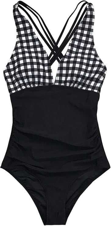 Design: costum de baie la modă, bretele elastice încrucișate în spate, model în carouri, croială care îmbrățișează silueta