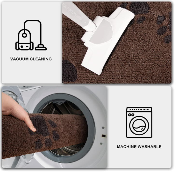 Suprafața covorului din poliester rezistentă la pete și la decolorare poate fi curățată cu ușurință prin aspirare. Pentru o curățare mai profundă, spălați la mașină separat în apă rece, folosind detergent slab. Nu folosiți înălbitor sau balsam de rufe. Covorașul nostru nu se va decolora sau nu se va uza și va rămâne ca nou chiar și după spălări repetate.
