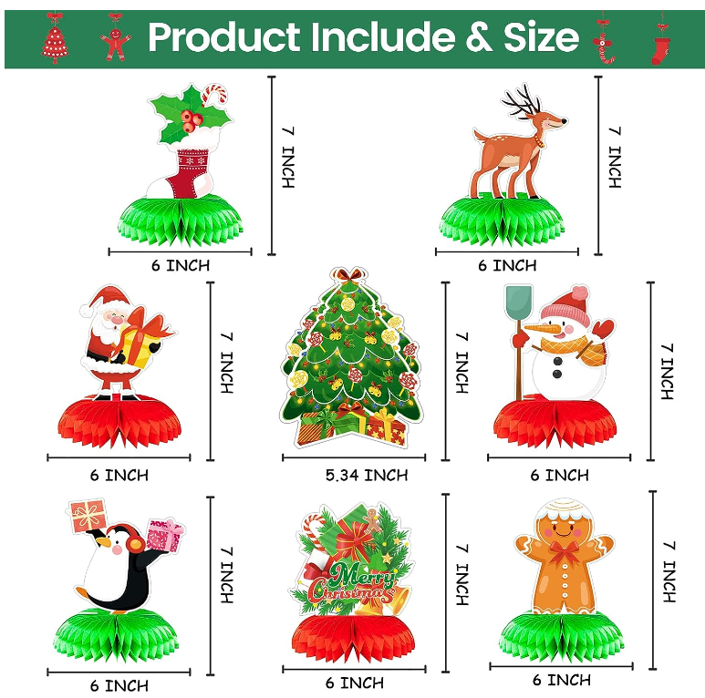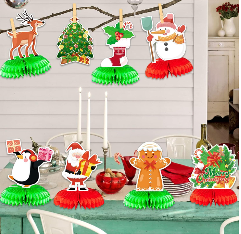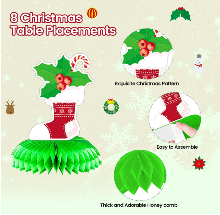 Decoratiuni amuzante de Craciun: setul de decoratiuni pentru masa de Craciun contine 8 piese decoratiuni de masa de tip fagure rosu si verde, toate concepute cu diferite modele, precum ciorapi de Craciun, ren, Mos Craciun, brad, om de zapada de Craciun, pinguin, semne vesele de Craciun, omul de turta dulce. Culorile strălucitoare de Crăciun și diferitele elemente de Crăciun sunt interesante și vibrante și pot contribui bine la atmosfera festivă a unei petreceri de Crăciun.