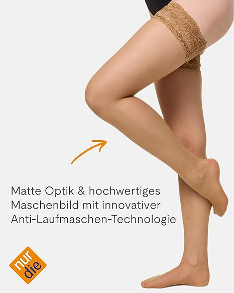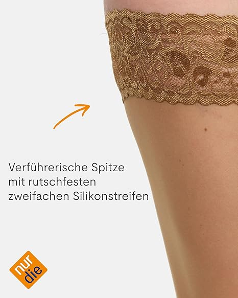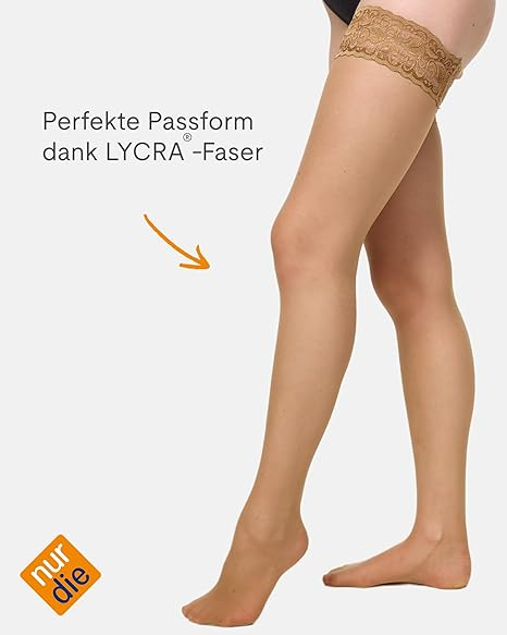 Ciorapi transparenți fără bretele cu aspect mat, cu aspect deosebit de uniform, tehnologia LYCRA FUSIONTM ajută la prevenirea rulării ochiurilor, aspect seducător datorită marginii din dantelă florală de înaltă calitate