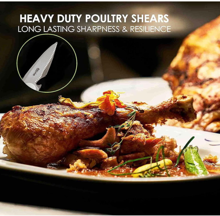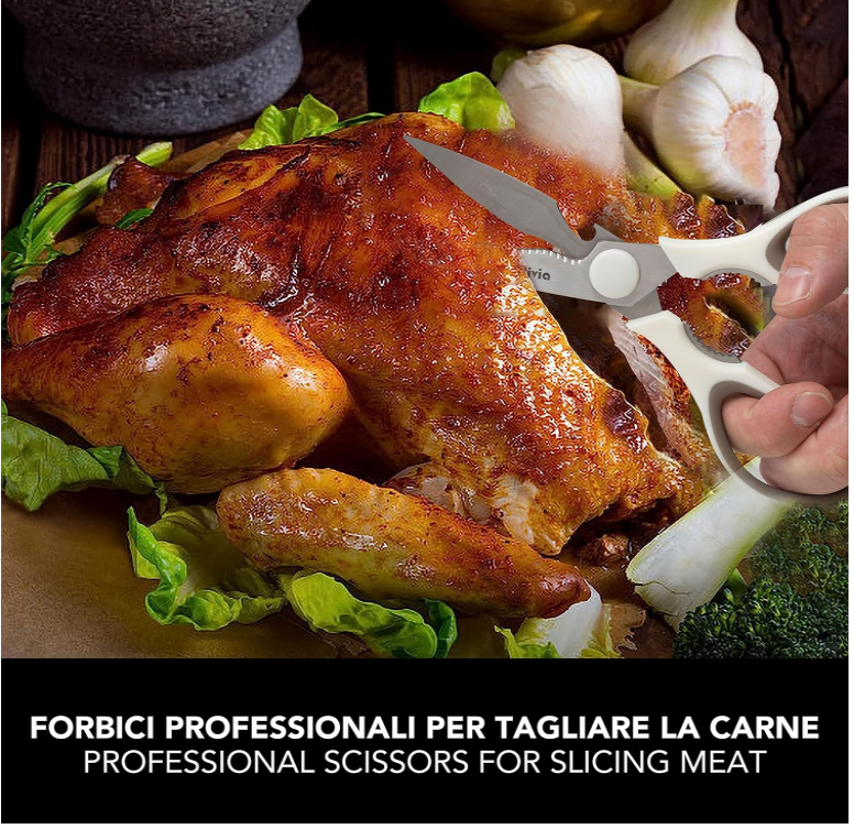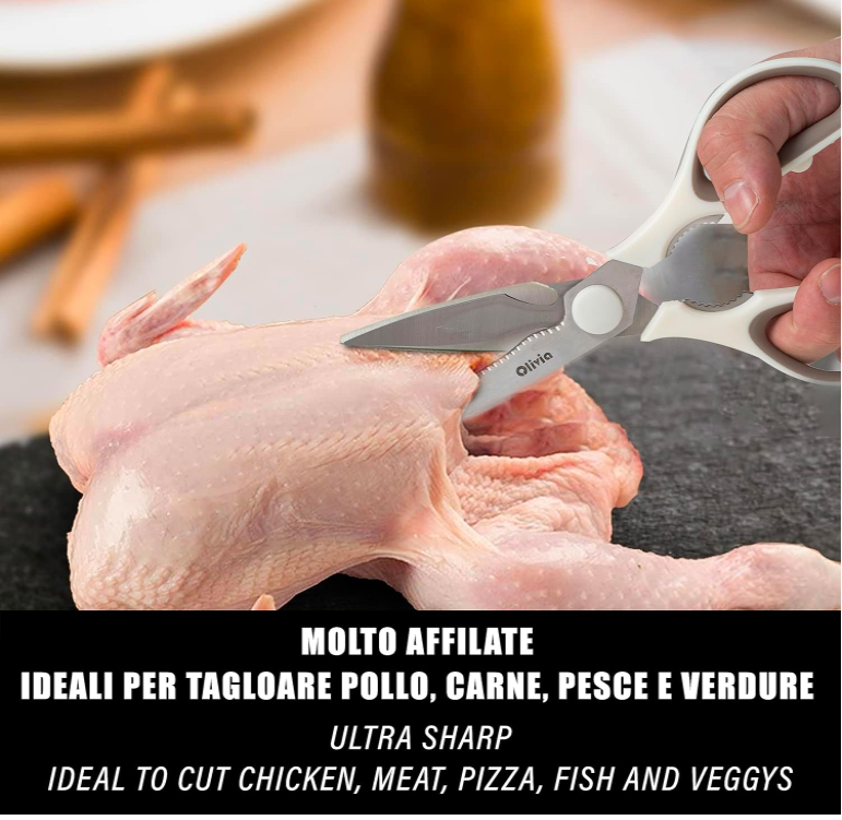 Lamele acestor foarfece sunt ascuțite și durabile, permițând tăieturi precise și curate. Sunt ideale pentru felierea cărnii, tăierea oaselor mici, tăierea puiului, descuamarea peștelui, tăierea pizza și orice alte alimente. Aceste foarfece de bucătărie multifuncționale sunt concepute pentru a oferi versatilitate în bucătărie.