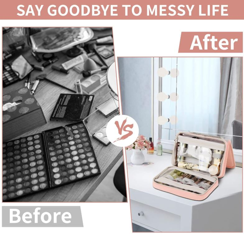 Economie de spațiu: Dimensiune: 24,13 × 18,29 × 6,35 cm geantă de toaletă, capacitate mare, dotată cu mai multe compartimente, poate ține diverse articole de toaletă, cosmetice sau accesorii de păr etc.