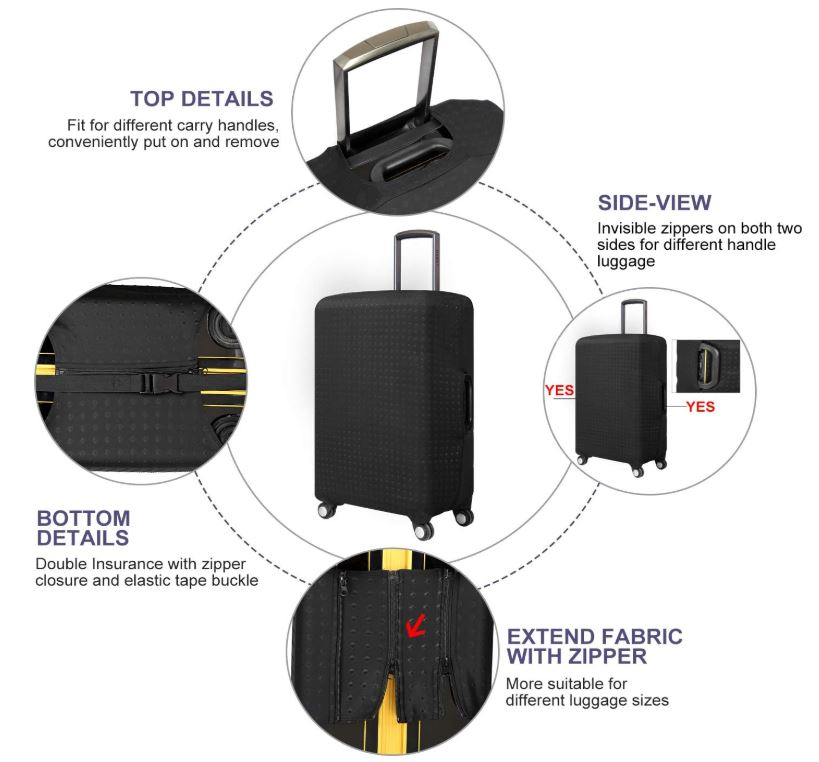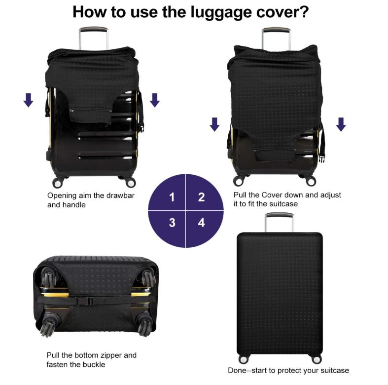 Asigurare dublă: fante superioare și laterale pentru acces ușor la mânerele bagajelor tale. Partea inferioară cu dublă asigurare (închidere cu fermoar și cataramă sigură), se potrivește rapid și ușor în câteva secunde, ușor de aplicat și îndepărtat.