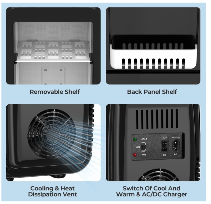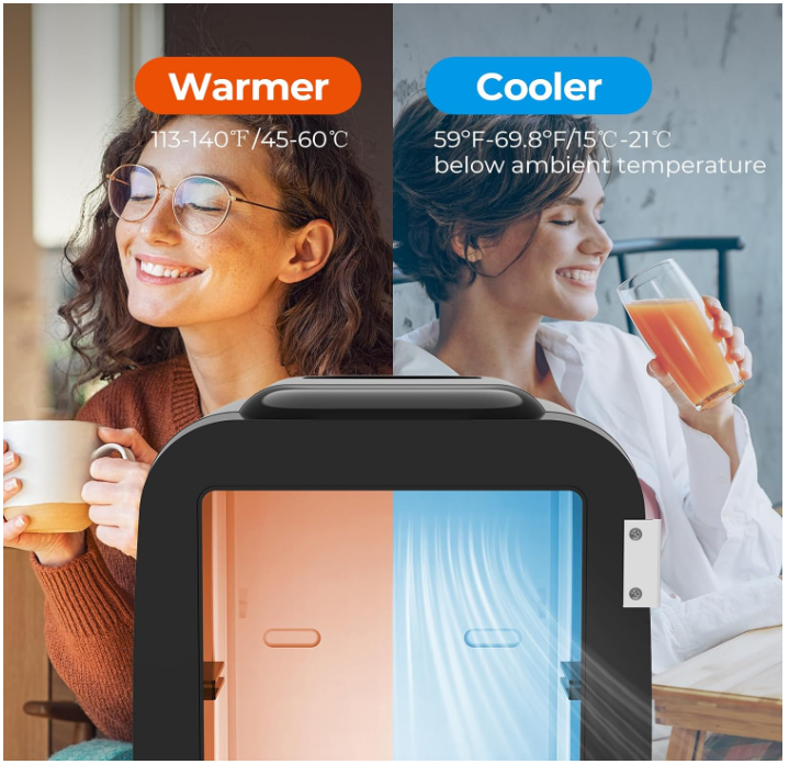 Răcire și termostatic: Când temperatura mediului ambiant este de 64,4-68 °F (18-20 °C), temperatura internă a frigiderului poate ajunge la 33,8-35,6 °F (1-2 °C) în timpul răcirii. Alegeți și modul de încălzire, temperatura internă a frigiderului poate ajunge la 149°F (65°C) pentru a vă satisface nevoia de a vă păstra alimentele, băuturile și alte articole la temperatura optimă.