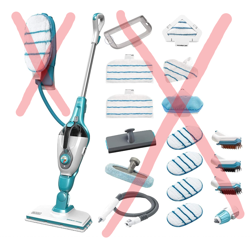 O soluție de curățare versatilă datorită celor 12 accesorii ale sale. Articolul este furnizat cu 1 tampon de podea din microfibră, 1 furtun flexibil de abur de 1,2 m, 1 racletă, 1 capac din microfibră pentru racletă, 1 duză reglabilă cu jet de abur, 1 perie rotundă de cupru, 1 perie rotundă, 1 perie specială pentru chit, 1 cadru adaptor covor/covor, 1 mănușă STEAMITT cu furtun de 1,5 m și 2 plăcuțe din microfibră pentru mănuși