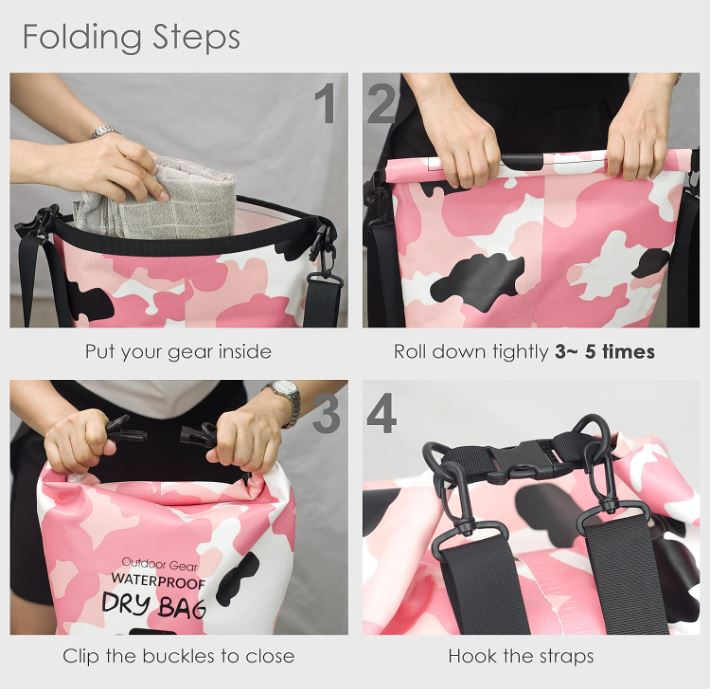 Ușor de utilizat: pur și simplu puneți echipamentul în geantă, luați banda țesută în sus și rulați-o ferm de 3 până la 5 ori, apoi conectați catarama pentru a finaliza sigilarea. Întregul proces este foarte simplu și rapid. Pentru ca geanta să plutească mai bine pe apă, ar trebui să lăsați puțin mai mult spațiu pentru aer.