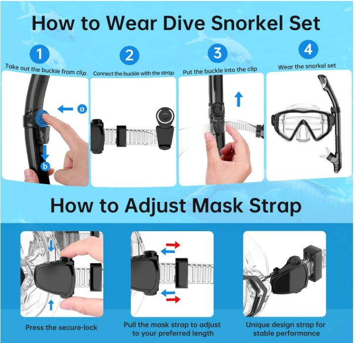 Sistem de ajustare rapidă: masca de snorkel pentru scufundări este echipată cu un sistem de ajustare rapidă care vă permite să ajustați rapid și ușor masca pentru a obține o potrivire perfectă. Curea reglabilă care poate fi ajustată la orice formă a feței; catarama detașabilă a snorkelului cu eliberare rapidă vă permite să deconectați și să conectați rapid masca și snorkelul cu o singură apăsare sau presiune, făcând operarea mai confortabilă