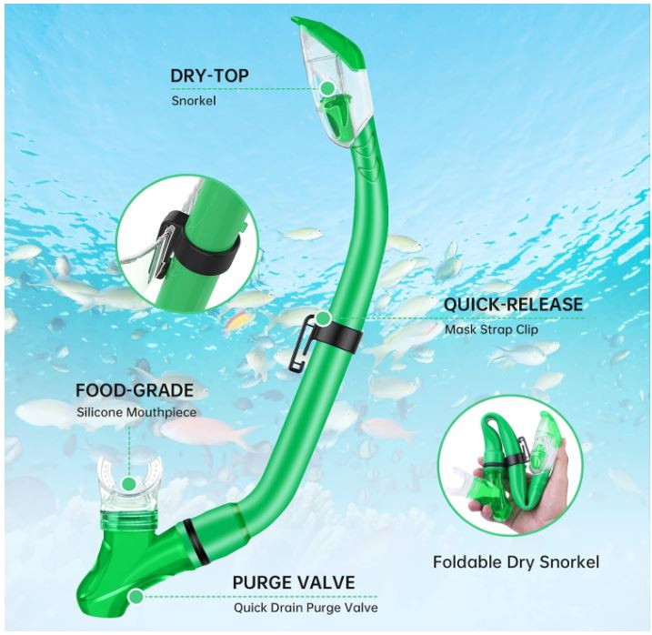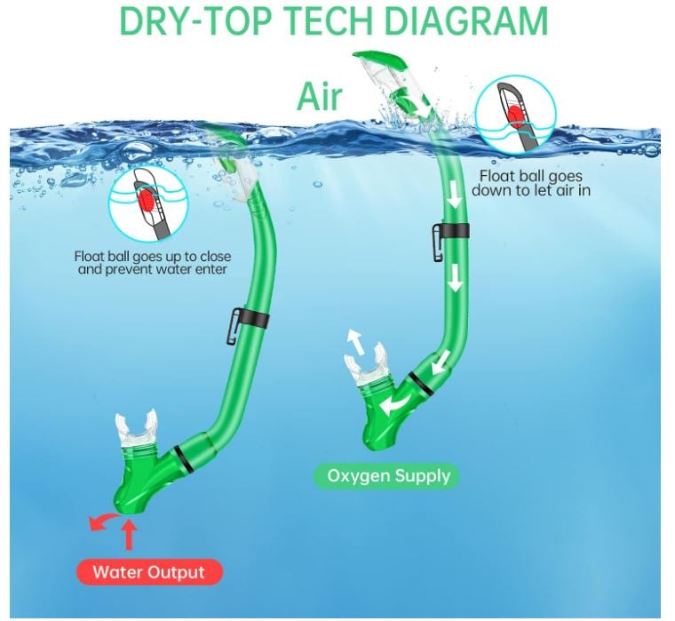 Mască de scufundări cu tub snorkel pentru copii: Masca noastră de scufundare cu snorkel pentru copii are un sistem avansat de protecție împotriva stropilor care lasă aerul să intre în timpul scufundării și blochează automat pentru a preveni intrarea apei în snorkel atunci când vă aflați sub linia de plutire. Supapa de spălare facilitează curățarea și scurgerea apei din tub, făcând snorkellingul mai distractiv, mai sigur și mai ușor.